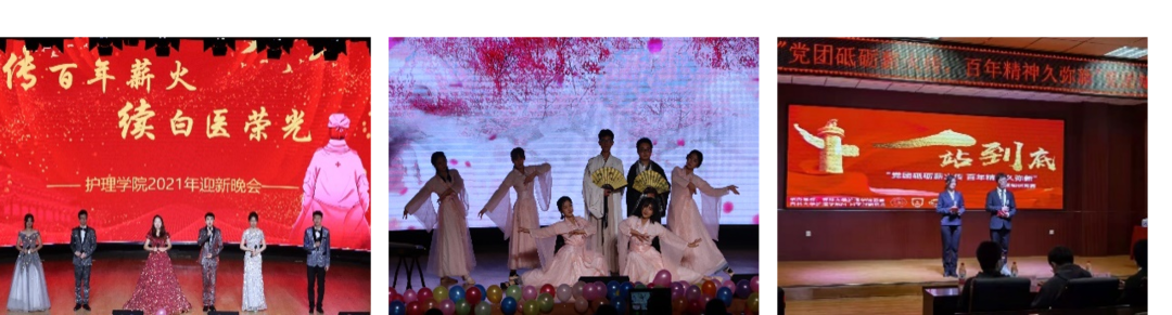 学院秉承立德树人根本任务,以习近平新时代中国特色社会主义思想为指导,以弘扬和传承白求恩精神、南丁格尔精神为己任,以丰富多彩的校园文化活动和社会实践活动为载体,在校园文化建设和学生综合素质培养方面取得优异成绩。持续开展纪念5·12国际护士节系列活动、迎新晚会、创新创业系列讲座、文化播讲团、歌手大赛、女生文化节、寝室文化节、先锋论坛辩论赛等校园文化活动;依托“天使心”职业道德教育基地、天使志愿者协会为学院学生提供志愿服务平台,走进社区、社会福利院、特殊教育学校、星光特教等开展关爱社会弱势群体、健康帮扶、健康宣讲,每年组织志愿服务活动近百次;利用寒暑期奔赴河北、大连、山东、通榆等地开展社会实践活动,为当地居民进行健康知识宣教,开展送医送药活动,用实际行动践行白求恩精神、南丁格尔精神,提高学生综合素质,提升学生人文素养,增强学生社会责任感和奉献意识。