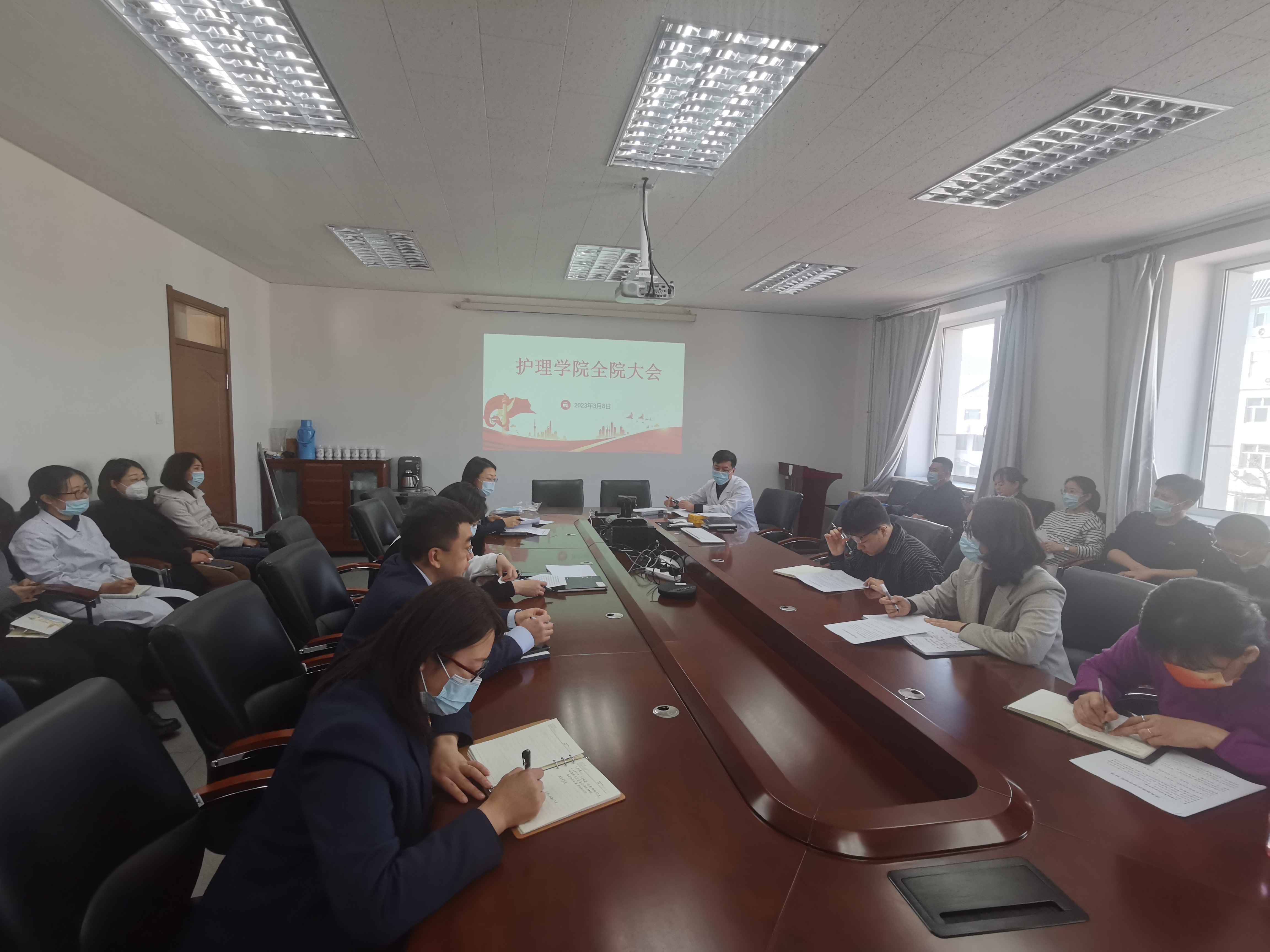 在三楼会议室召开2023年第二次全院教职工大会,全体教职工参加会议,会议由院党委书记韩月波主持。