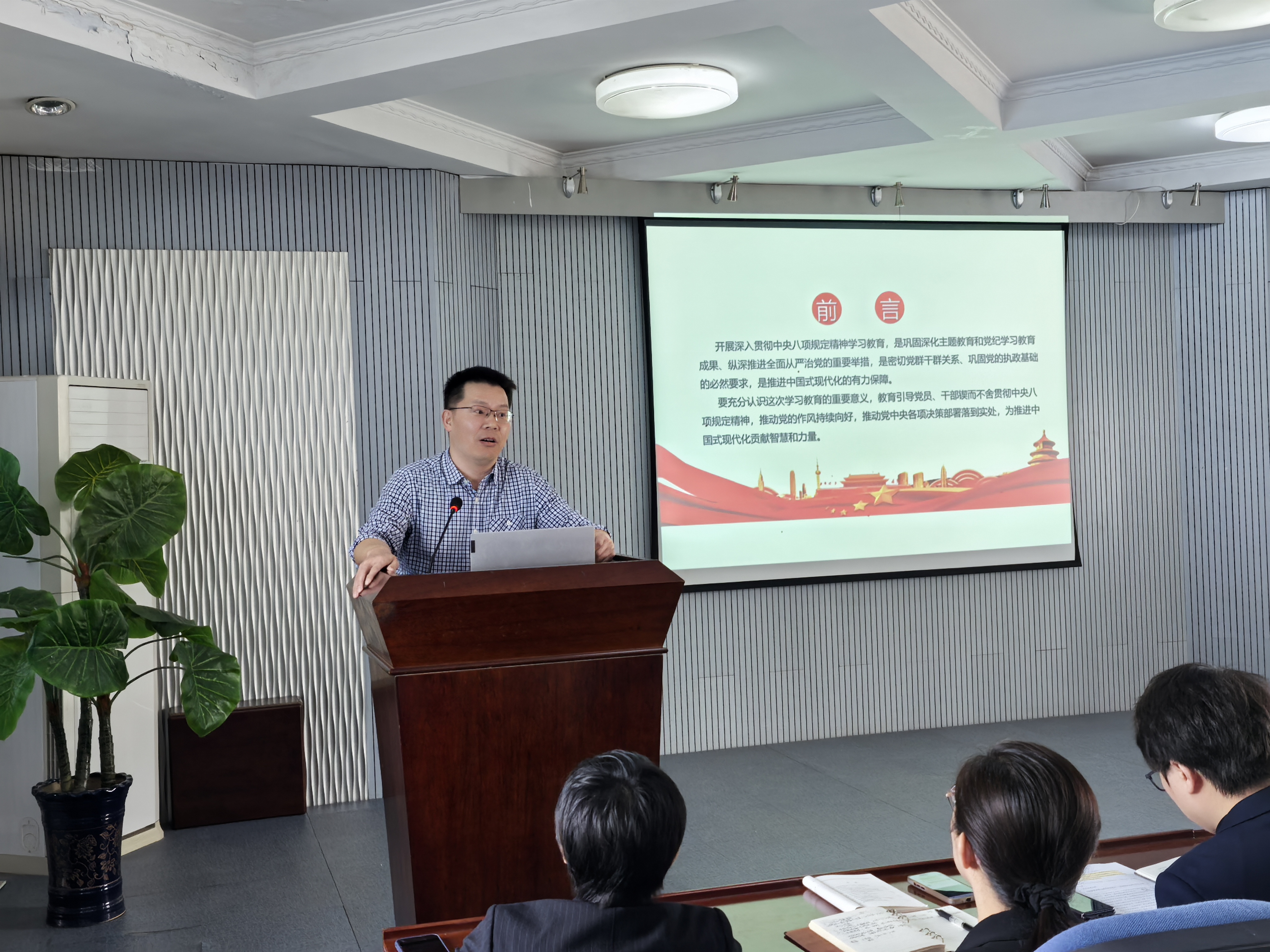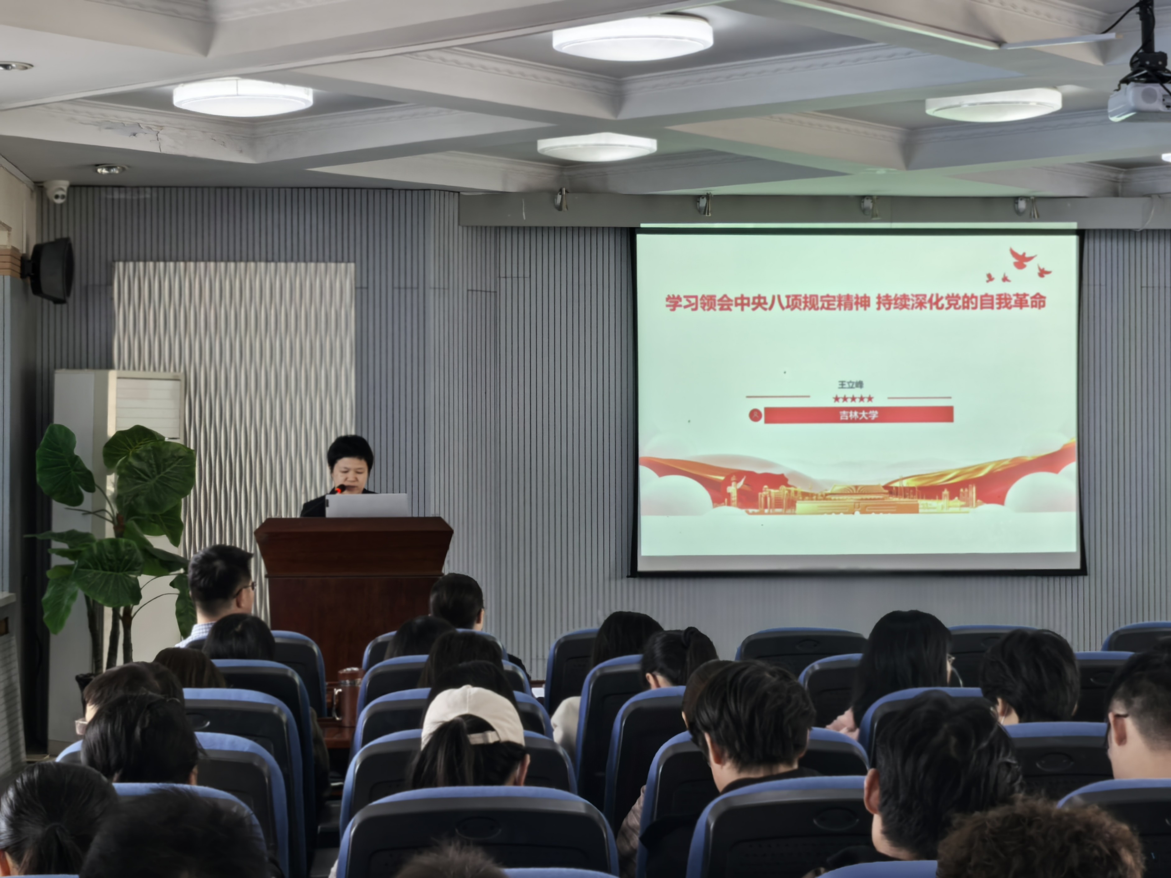 报告会上,王立峰教授以“学习领会中央八项规定精神, 持续深化党的自我革命”为主题,展开了一场内容丰富、思想深刻的报告。王老师从中央八项规定精神的出台背景、核心要义讲起,结合大量详实案例,深入阐述了中央八项规定精神对于改进工作作风、密切联系群众的重要意义。他强调,持续深化党的自我革命是党保持先进性和纯洁性的关键,而贯彻落实中央八项规定精神正是自我革命的具体实践,希望与会人员时刻保持清醒,强化组织观念,严守纪律红线。