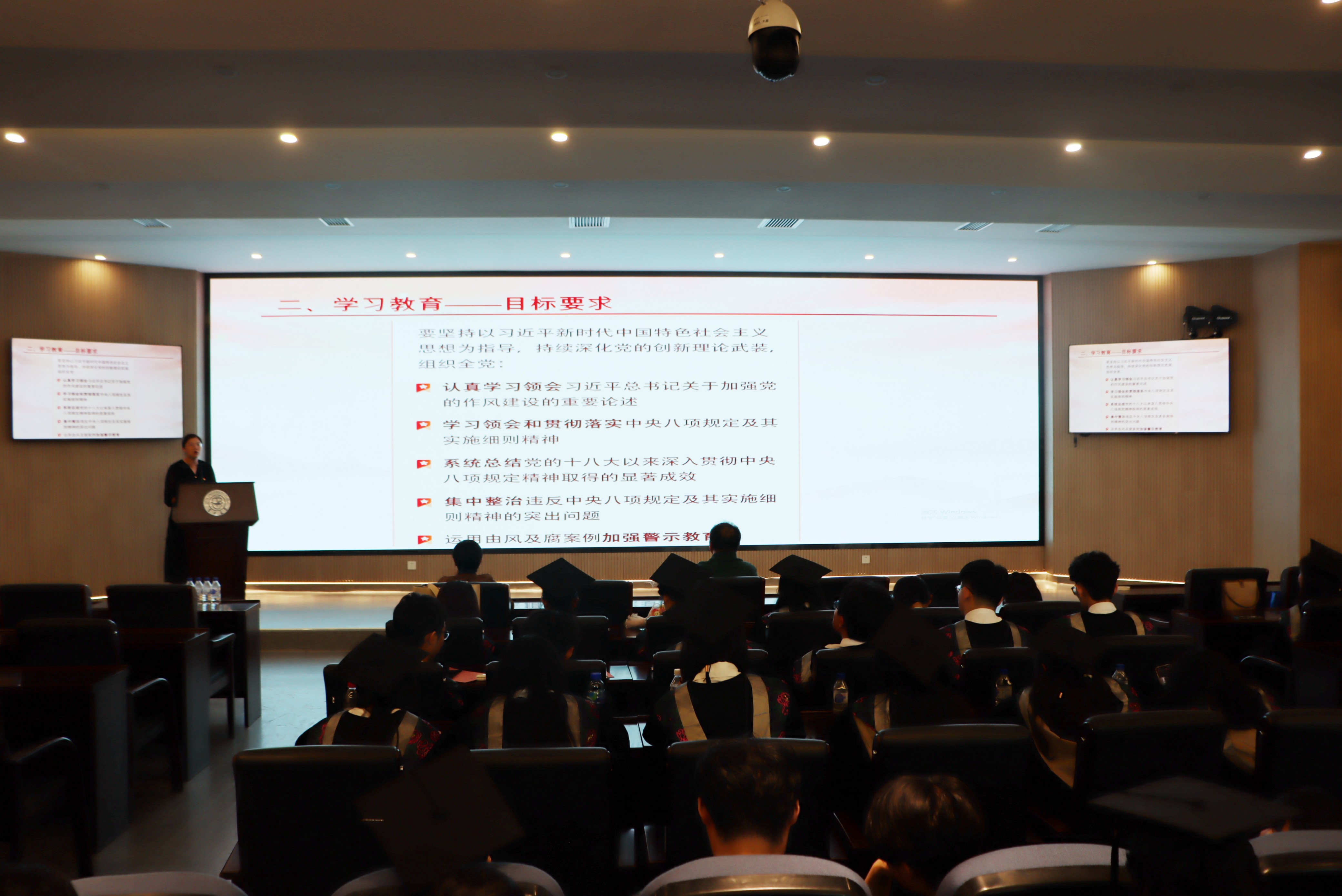 韩月波书记以“青春向党 筑梦远航”为主题,以深学细悟八项规定精神的丰富内涵、重要意义和实践要求为主线,从政治、经济、社会、文化、国家治理五个维度系统总结中央八项规定精神的成效经验,并结合典型案例,深入剖析了违反中央八项规定精神的具体表现和严重危害,教育引导毕业生党员深切领悟违规违纪违法问题常常肇始于小事小节的疏忽失守,要时刻保持清醒头脑,增强纪律意识和规矩意识,将“眼中所见的反面教训”切实内化为“心底长存的敬畏戒惧”,持续强化遵规守纪的思想自觉与行动自觉,做到心中有党、心中有民、心中有责、心中有戒,以坚定决心守住中央八项规定精神这条不可逾越的铁律红线。